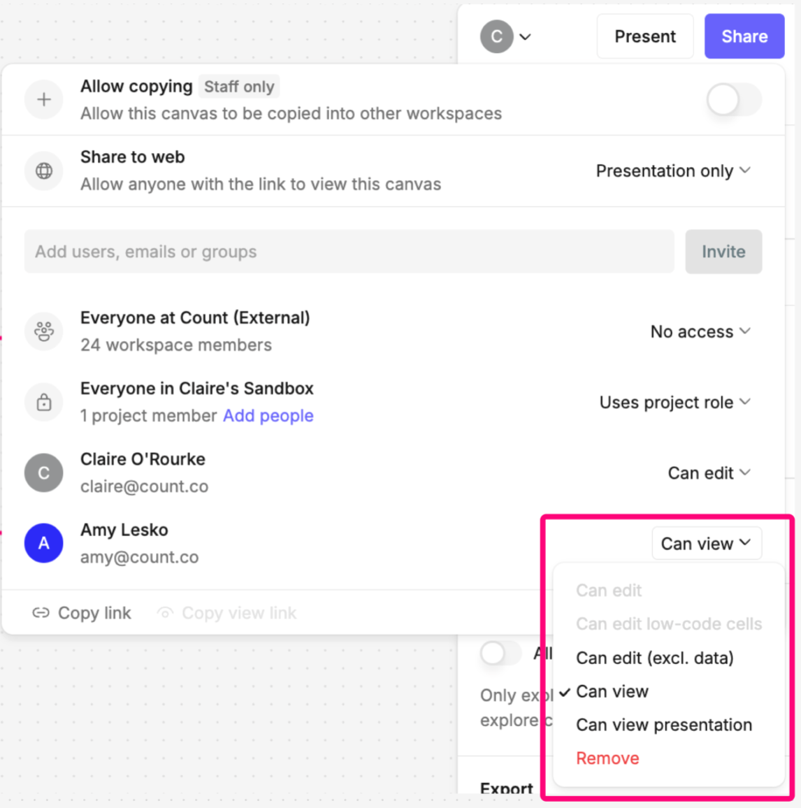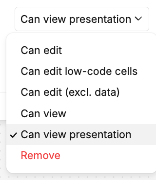If you want users to participate in the analysis, editing cells, you can grant edit access within the share menu in the top right corner. You can grant users view access so they can dive into all the details of the analysis, without being able to make changes.