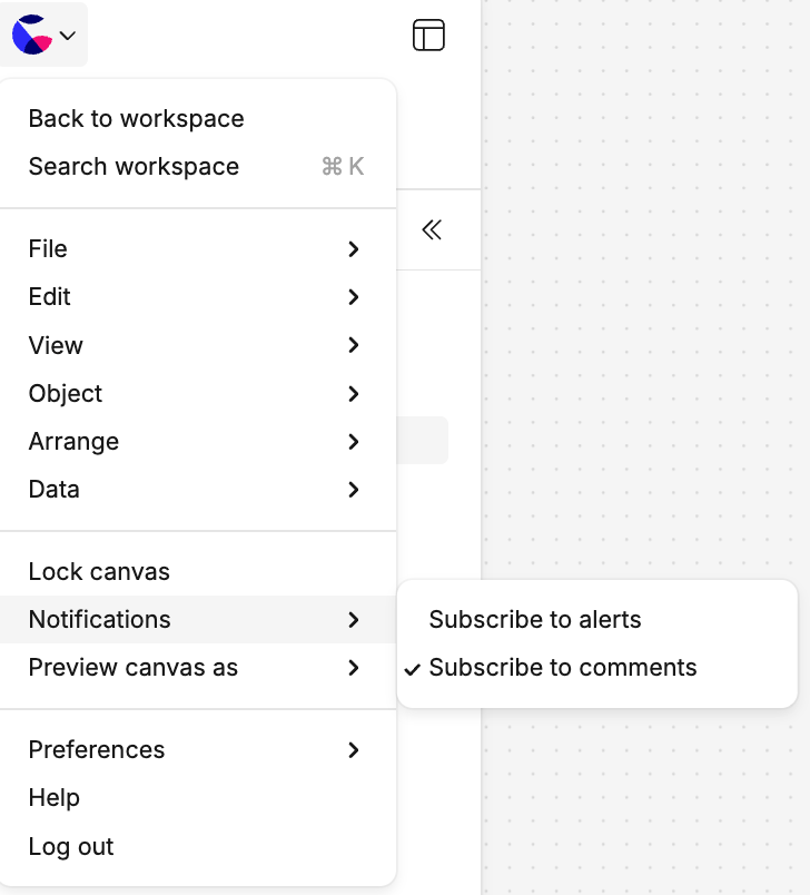 To stop receiving email notifications about comments, disable them from the canvas menu: