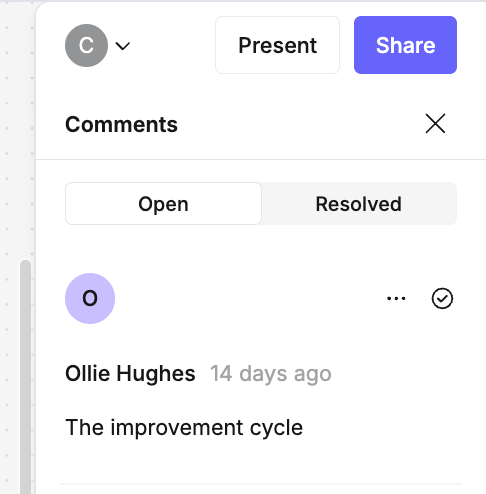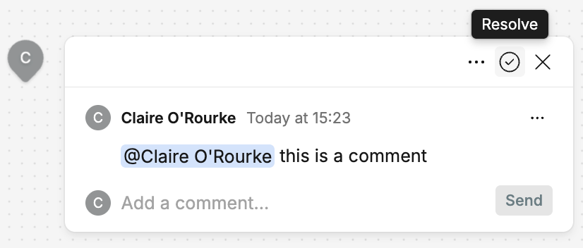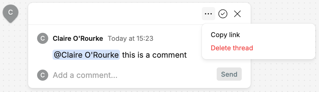 When viewing a comment in the canvas, clicking the tick icon will resolve the thread: This will move the comments in this thread to the Resolved section of the comment menu, but will not delete them.