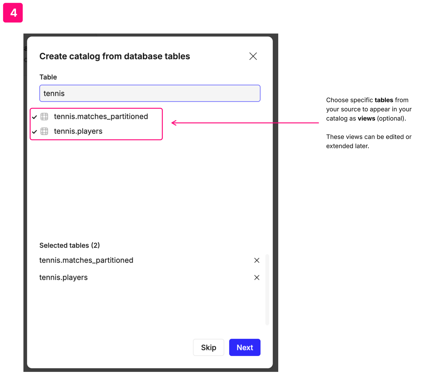 Choose specific tables from your source to appear in your catalog as views (optional). These views can be edited or extended later.