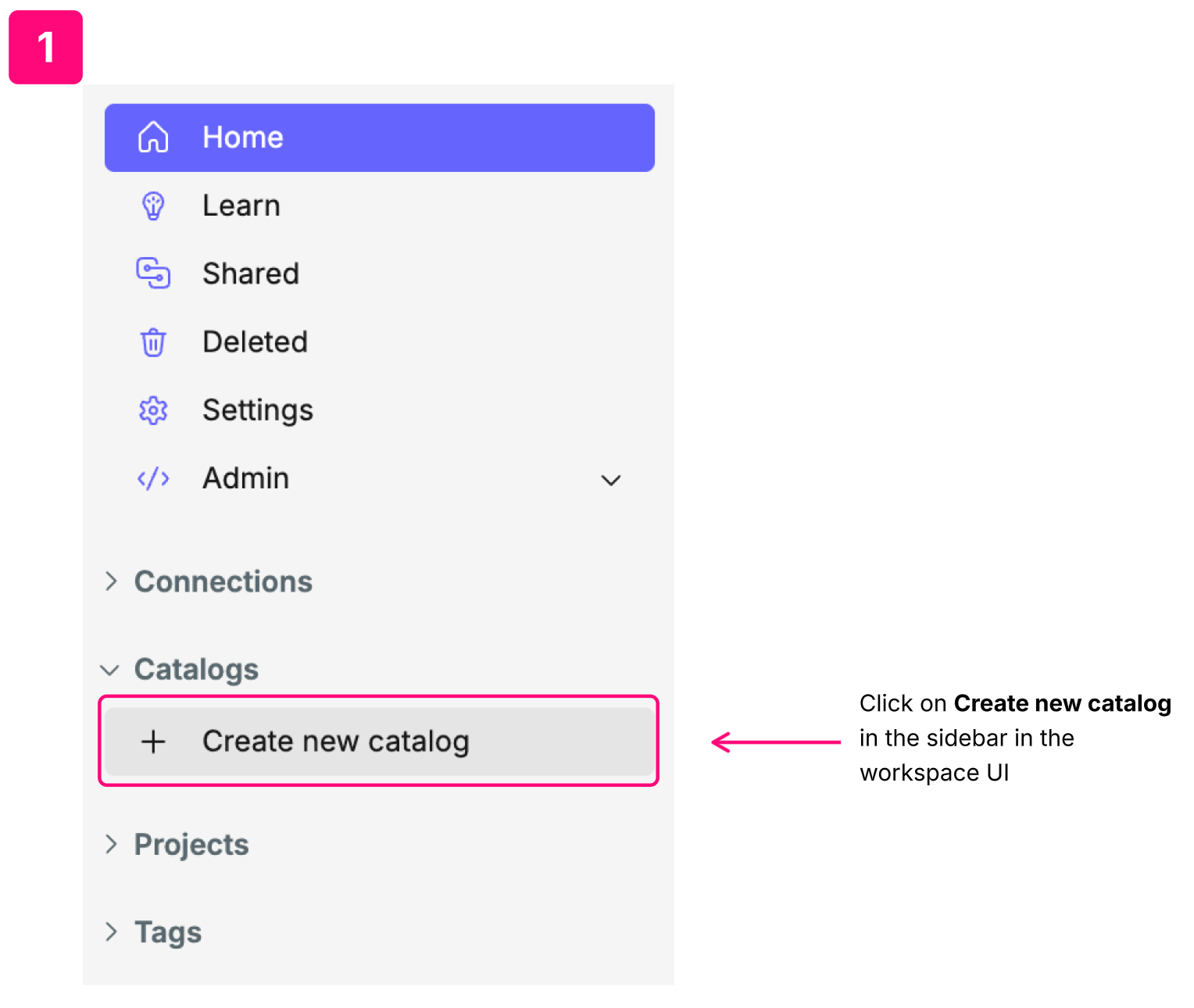 Click on Create new catalog in the sidebar of the workspace UI. You'll be prompted first to connect to Github,