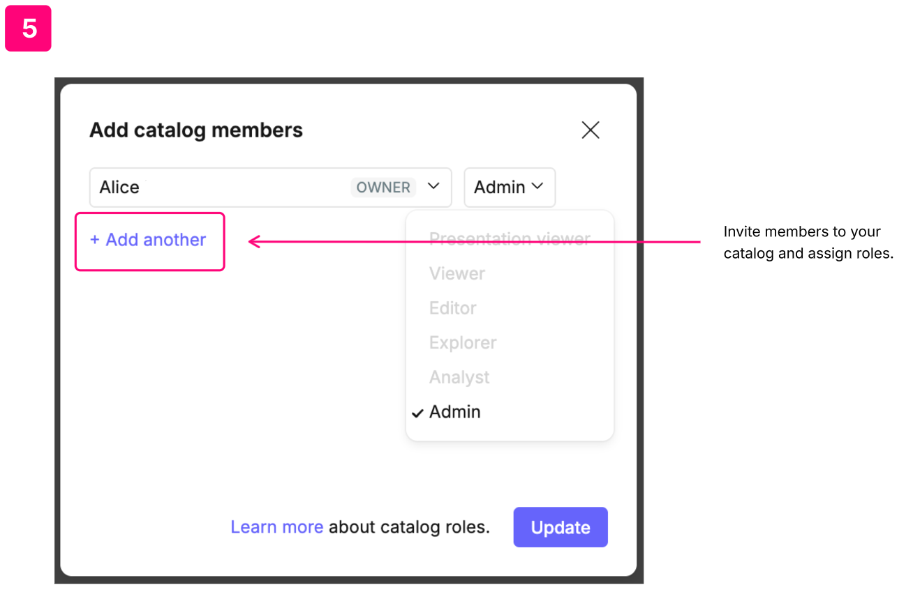The roles users can have on the catalog are limited by their workspace role. Workspace owners and admins can take on all catalog roles, analysts and viewers have a limited set of roles.