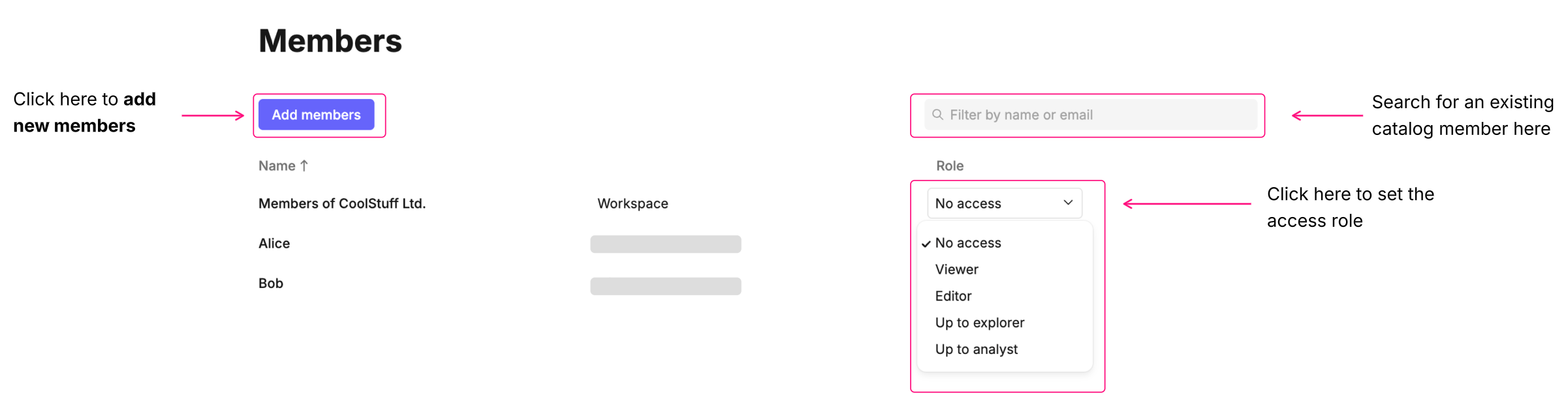 To add new members to the catalog, click Add members. Adjust access roles by using the dropdown next to each member. Use the search bar to find or filter existing members for easier management.