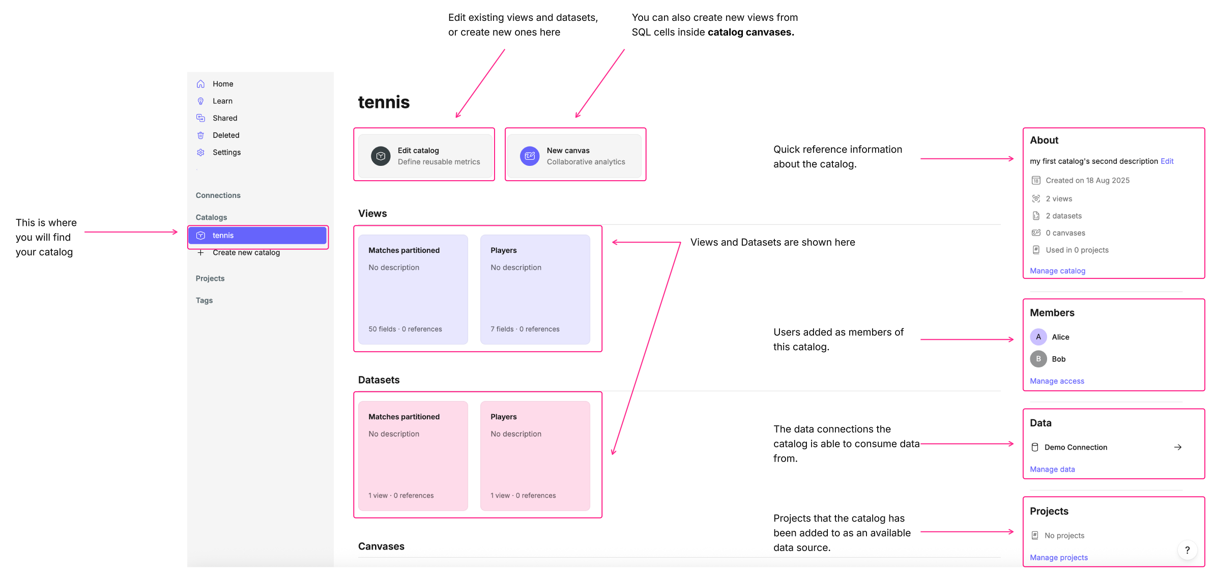 From the catalog’s main page, you can see all of the key information about your catalog at a glance, including its description, members, data sources, and views.