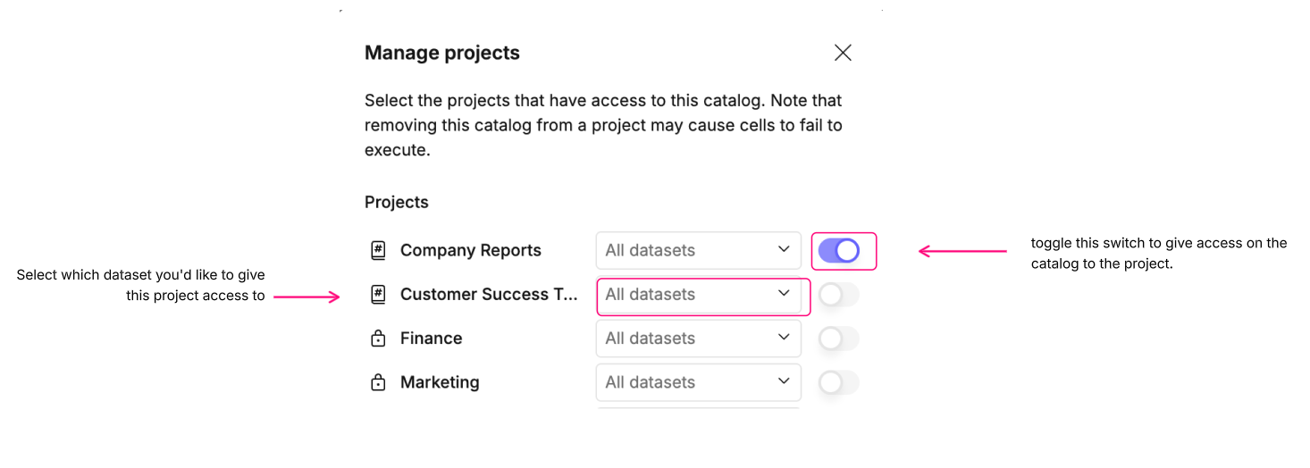 Adding a project to your catalog allows project members to use the catalog in their canvases or in explore mode on that project. Clicking Manage projects allows you to add or remove projects.