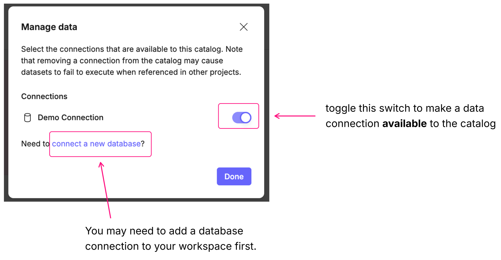 Adding new data sources is as easy as toggling the switch next to them in the Manage data dialog. You will be able to add all data sources that you have access to as a workspace member. If you can't see the data connection that you want to make available to the catalog, you either don't have access to add it to projects/catalogs or the connection doesn't exist.