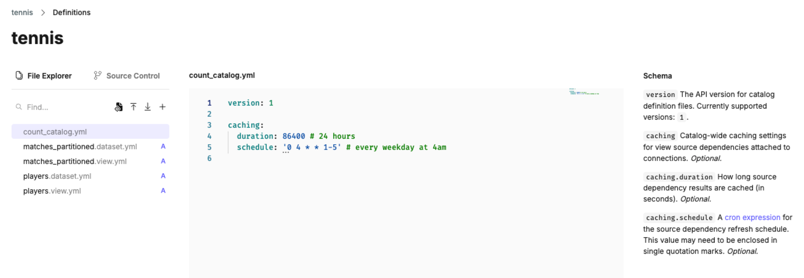 | caching | Catalog-wide caching settings for view source dependencies attached to connections. Optional. |