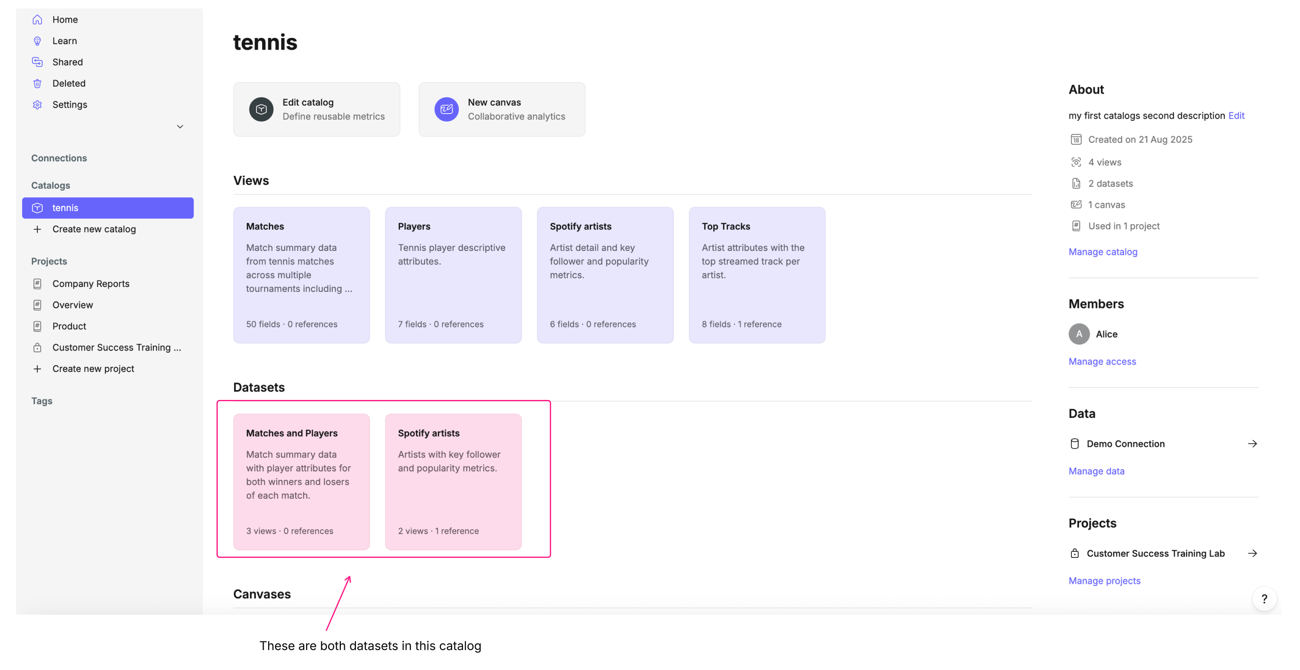 A dataset is a collection of views and the relationships between them, defining the structured tables that users interact with when querying data from the catalog in the canvas.