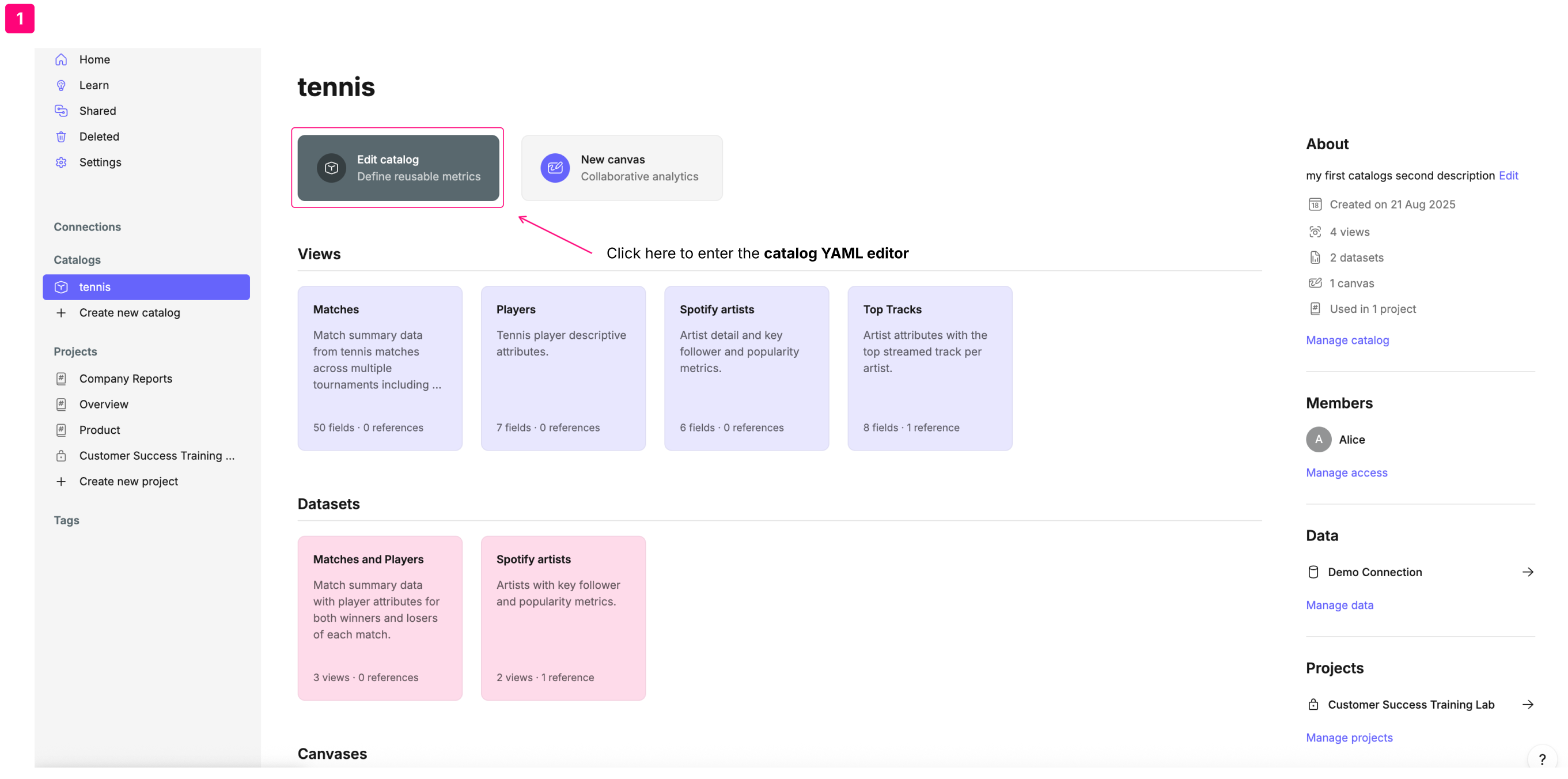 To create a dataset open the catalog YAML editor by clicking on Edit catalog