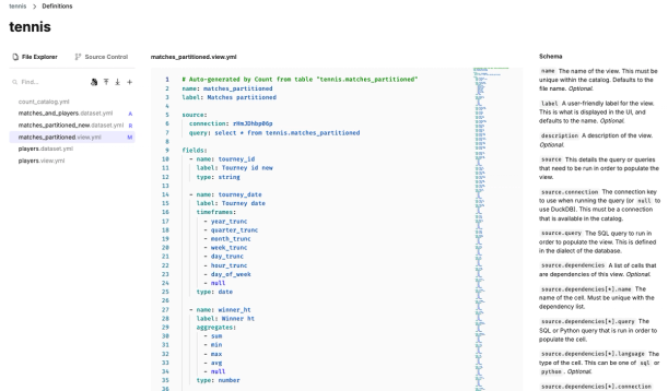 The view YAML are entirely customizable and can be edited directly in the catalog YAML editor. For a full overview of how to customize view YAML, see the following pages.