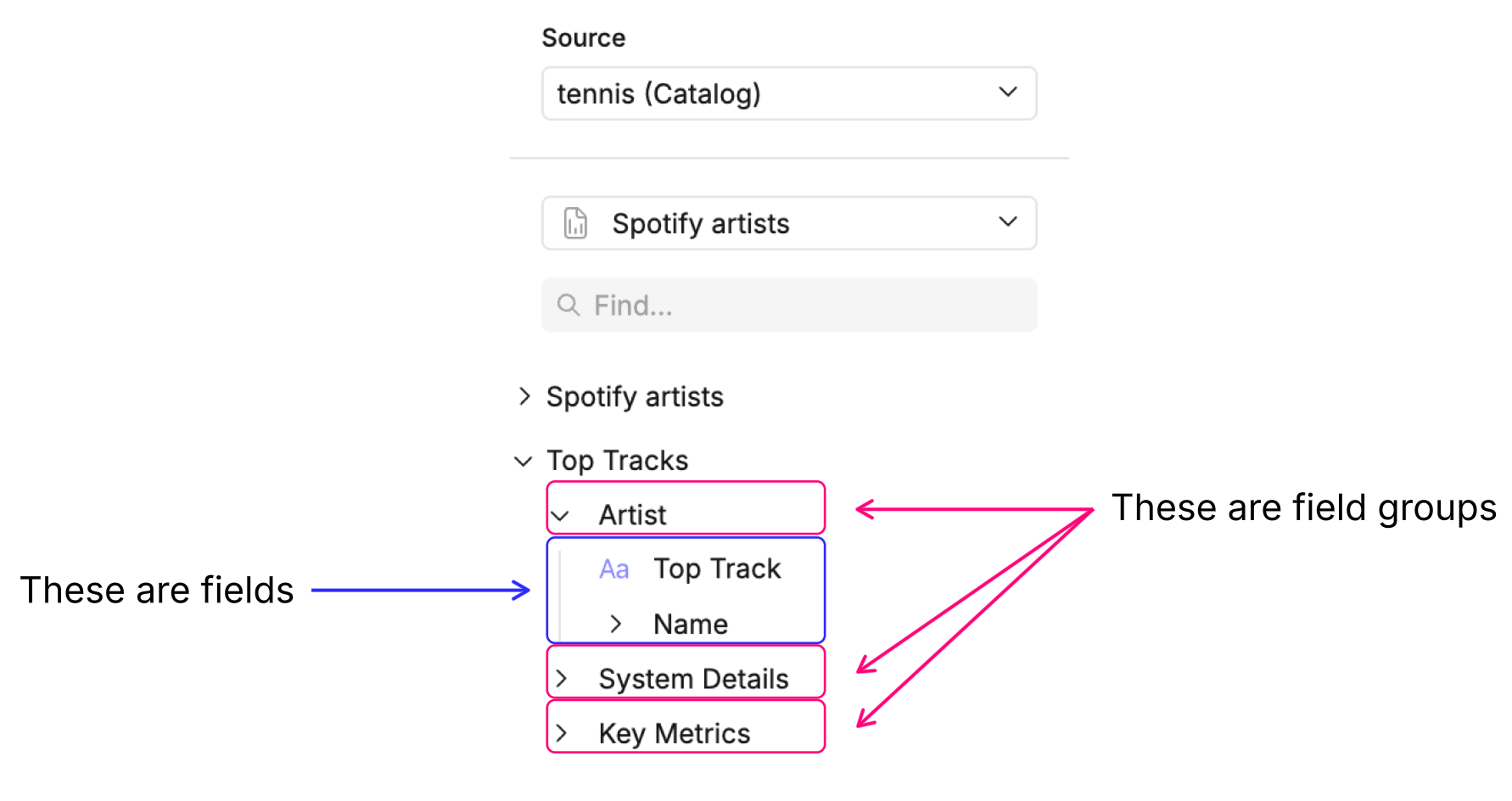 group: ArtistIn the canvas UI, field groups will appear as expandable sections that reveal their fields when clicked.