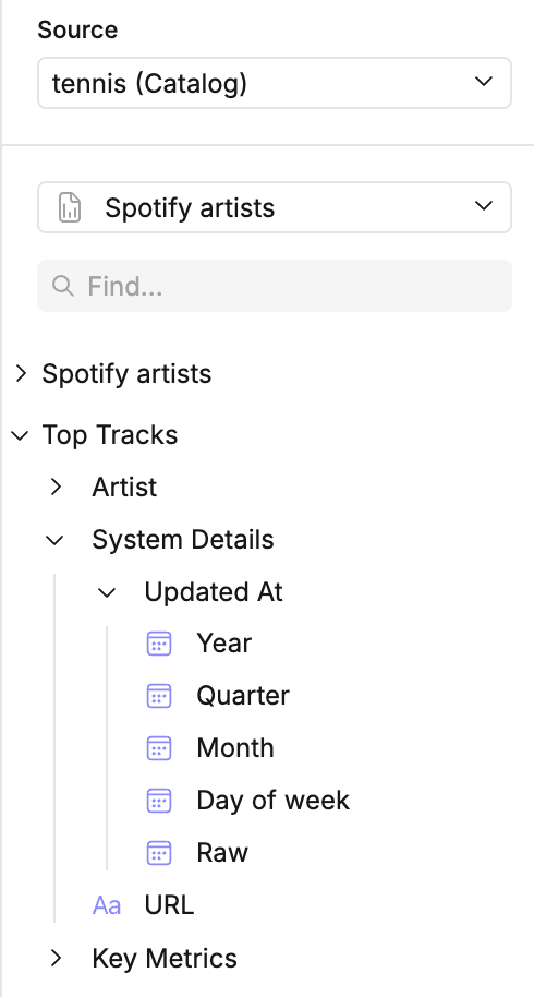 | fields[*].timeframes | A list of timeframes by which to group the field: year_trunc, quarter_trunc, month_trunc, week_trunc, day_trunc, hour_trunc, minute_trunc, second_trunc, year, quarter, month, week, day_of_year, day_of_month, day_of_week, hour, minute, second, null (where null means no function is applied). These will appear as a collapsible group in the UI. Optional. |