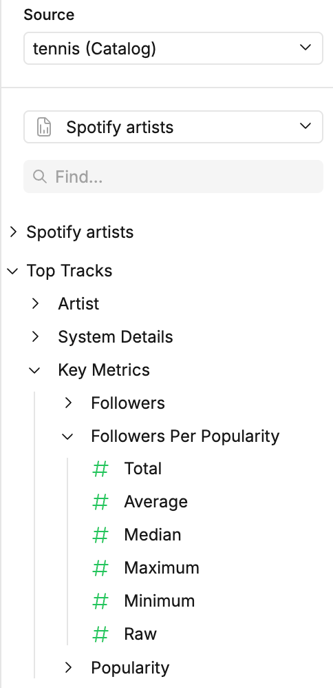 aggregates: [sum, avg, min, max, median, null]Custom calculated fields look no different to predefined fields in the canvas UI.