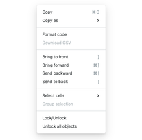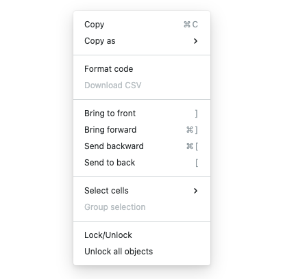 The cell context menu contains additional cell-specific options for formatting, copying, selecting, and downloading data from cells. Right-click anywhere on the cell to open it.