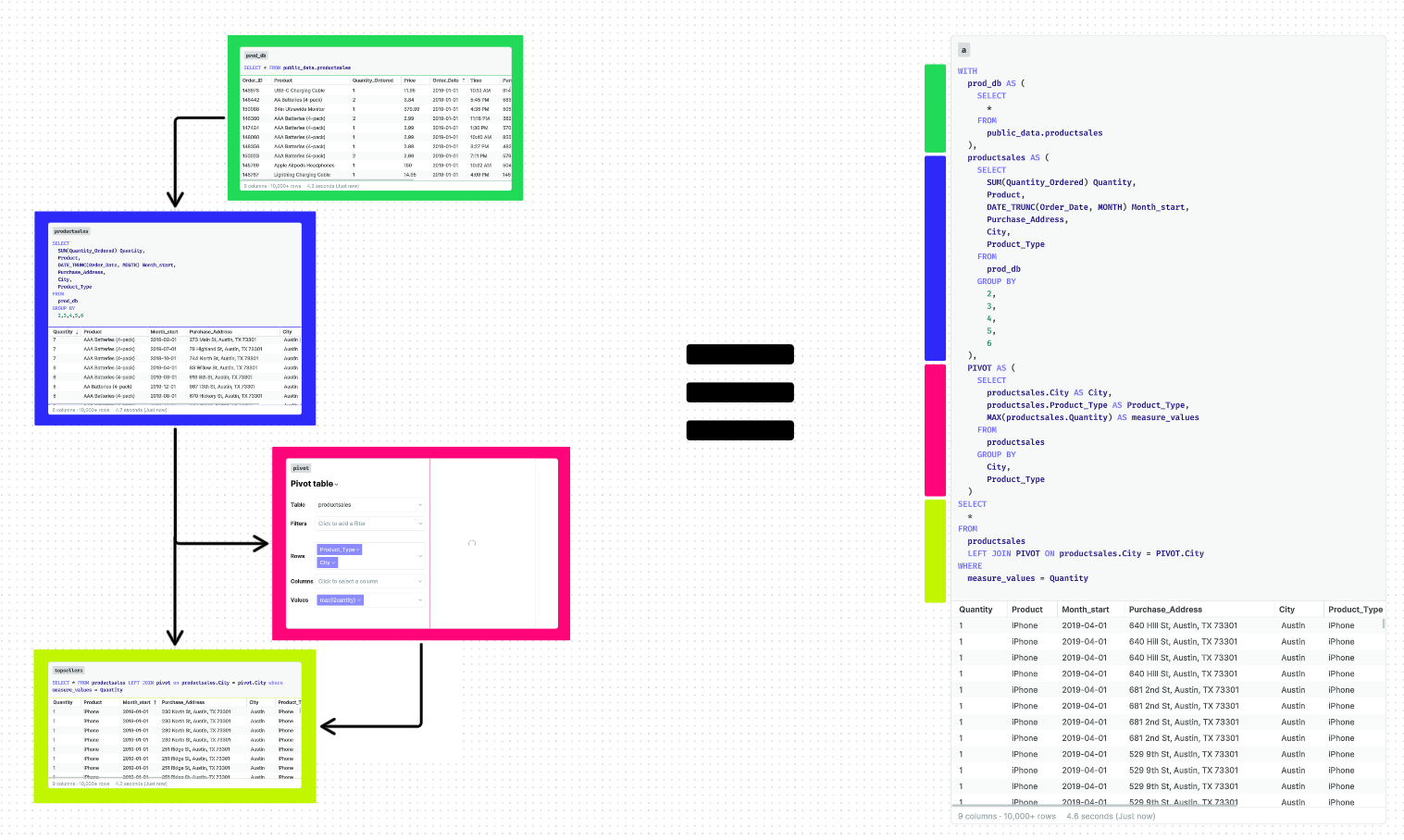 Each cell is a query that is sent either to your database, the local database, or Python. Count's dynamic query compilation engine compiles SQL at runtime.