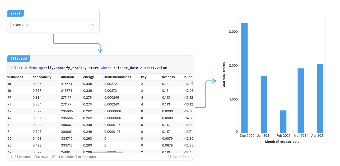 Because cells can reference a database or another cell, they can be chained together into a linear or branching analysis. This allows you to break complex problems into easier to solve chunks. Count automatically connects related cells to one another to make data flows easy to follow - this structure is called the DAG, and is indicated in the canvas with colored arrows between cells.