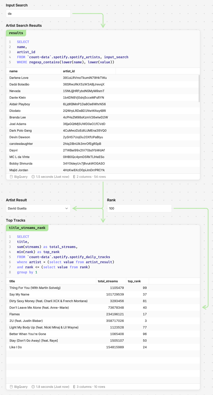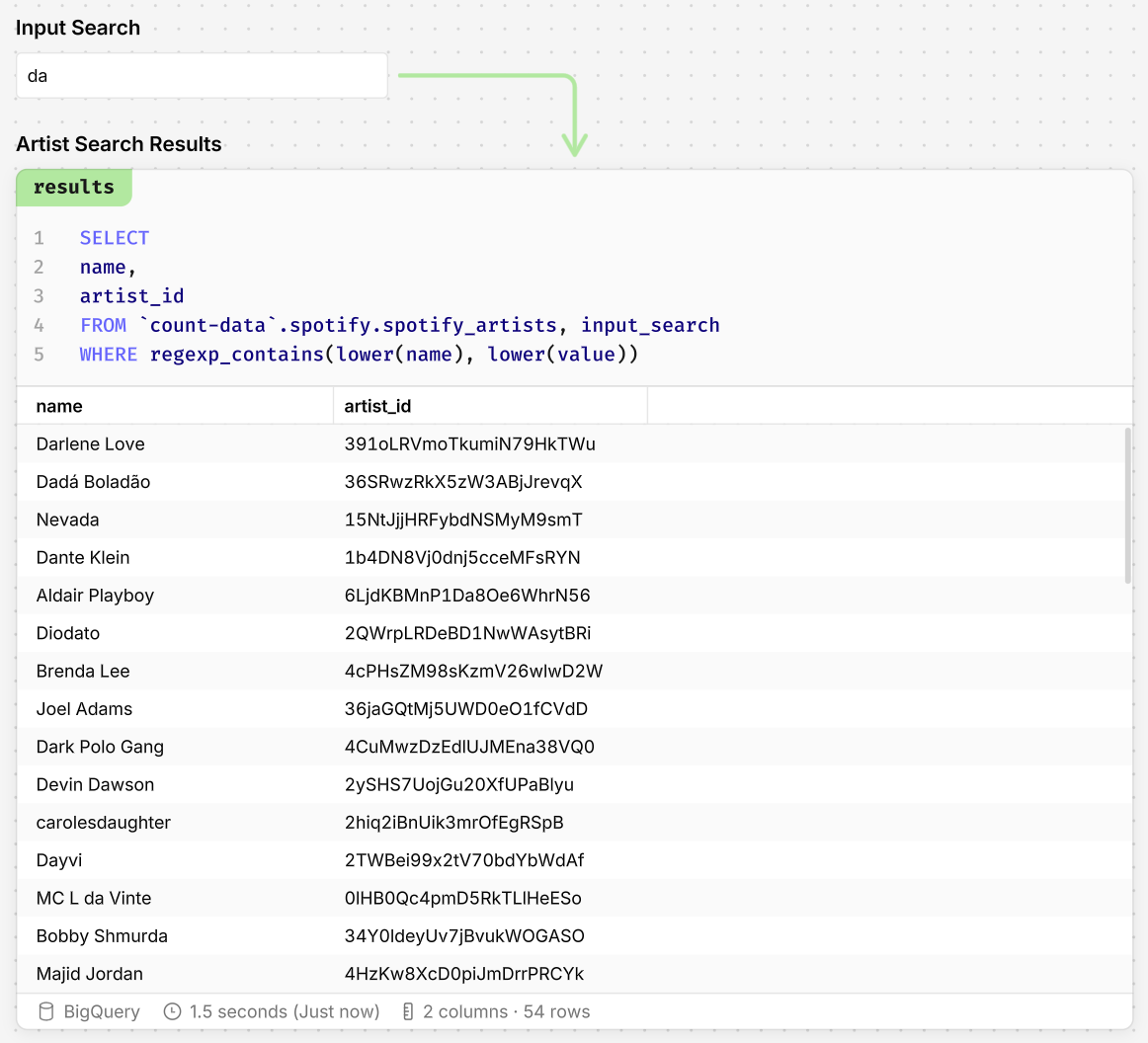 The result is a query which has taken a manual search term and output a filtered result using interactive controls.