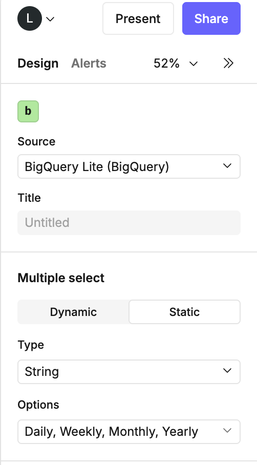 - Add in a multiple select control cell, setting the cell/table datasource and column as the current datasource and required filter.