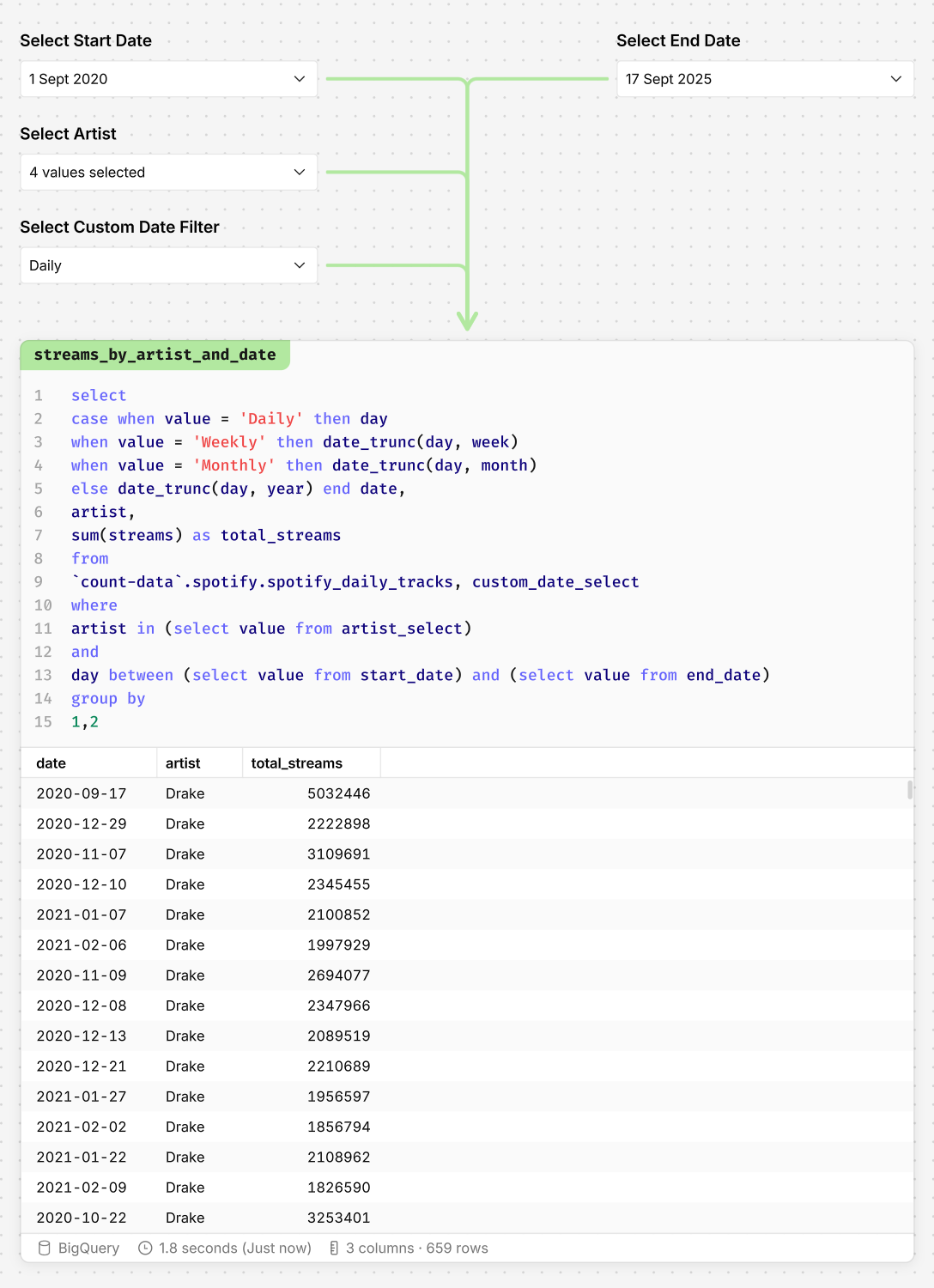 Now we want to be able to adjust the start and end date of our dataset, and also select one or more artists.