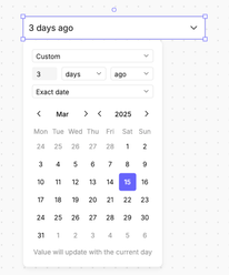 Date control cells can be configured by clicking on it and selecting either an exact or relative time. Hour-level granularity can be toggled on in the design bar on the right-hand side.