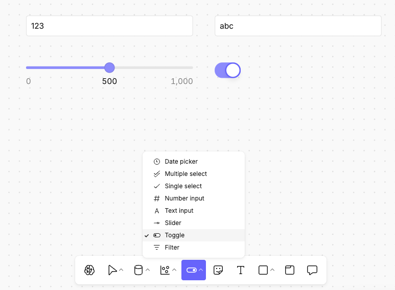 Use the canvas toolbar to insert the control cell you want to use. These simple controls include: