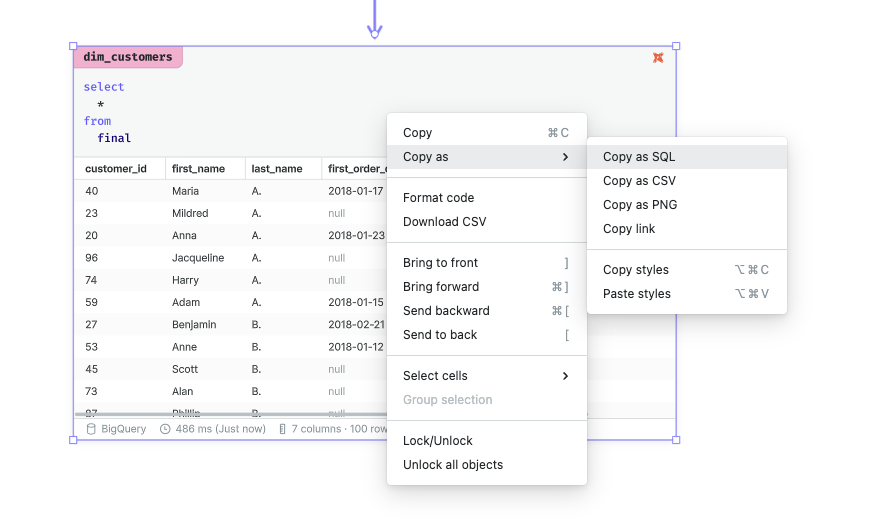 Selecting this option makes it possible to customise the number of upstream cells included in the exported SQL by selectively treating cells as dbt models. Use this option to generate code that is compatible with dbt.