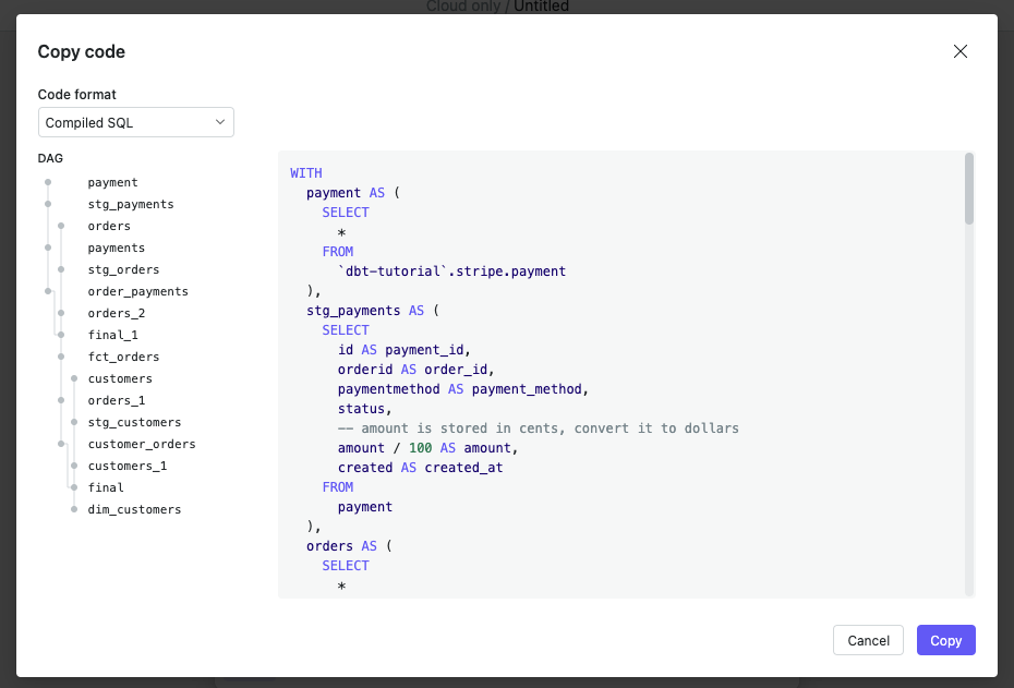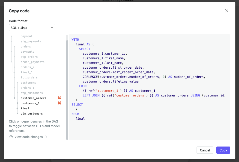 Clicking on a cell in the DAG summary will convert it to a model (indicated by the dbt symbol), which means that all cells further upstream need not be included in the compiled code. Any references to models are also converted to ref() invocations.