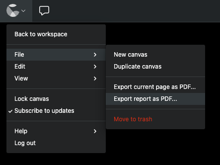 When viewing a report, the options to export report frames are accessible from the canvas menu: