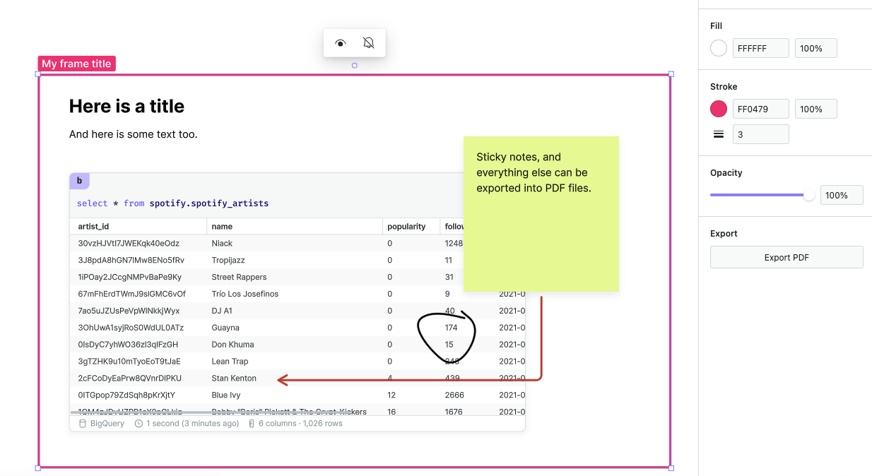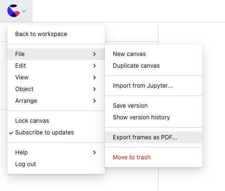 When a frame is selected, an Export PDF button is available in the design bar. Click this button to download a PDF file containing the contents of the selected frame.