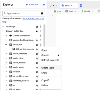 In your BigQuery editor, select the ellipsis next to a dataset and select Create table: