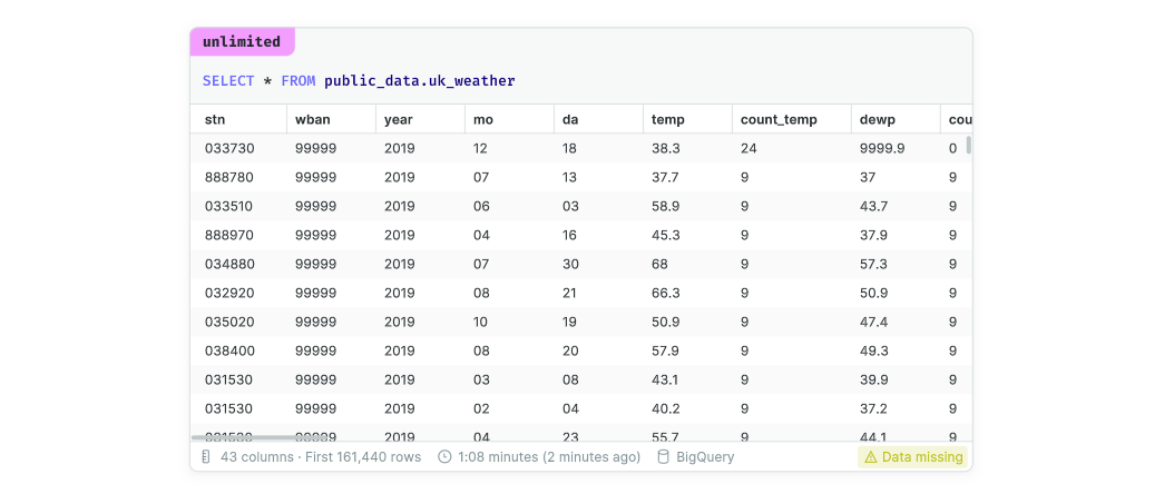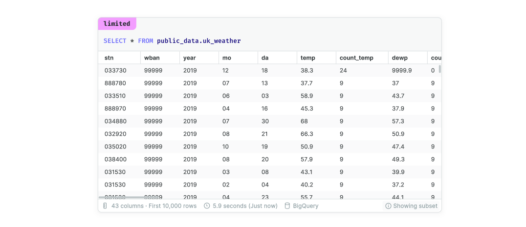 By default, Count applies a 10,000 row limit to all queries executed on your database. If the results of a query exceed this limit, a notification will be displayed in the table footer: