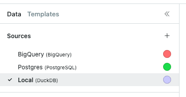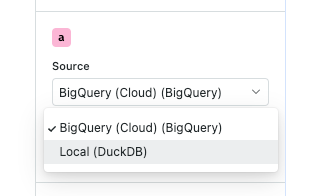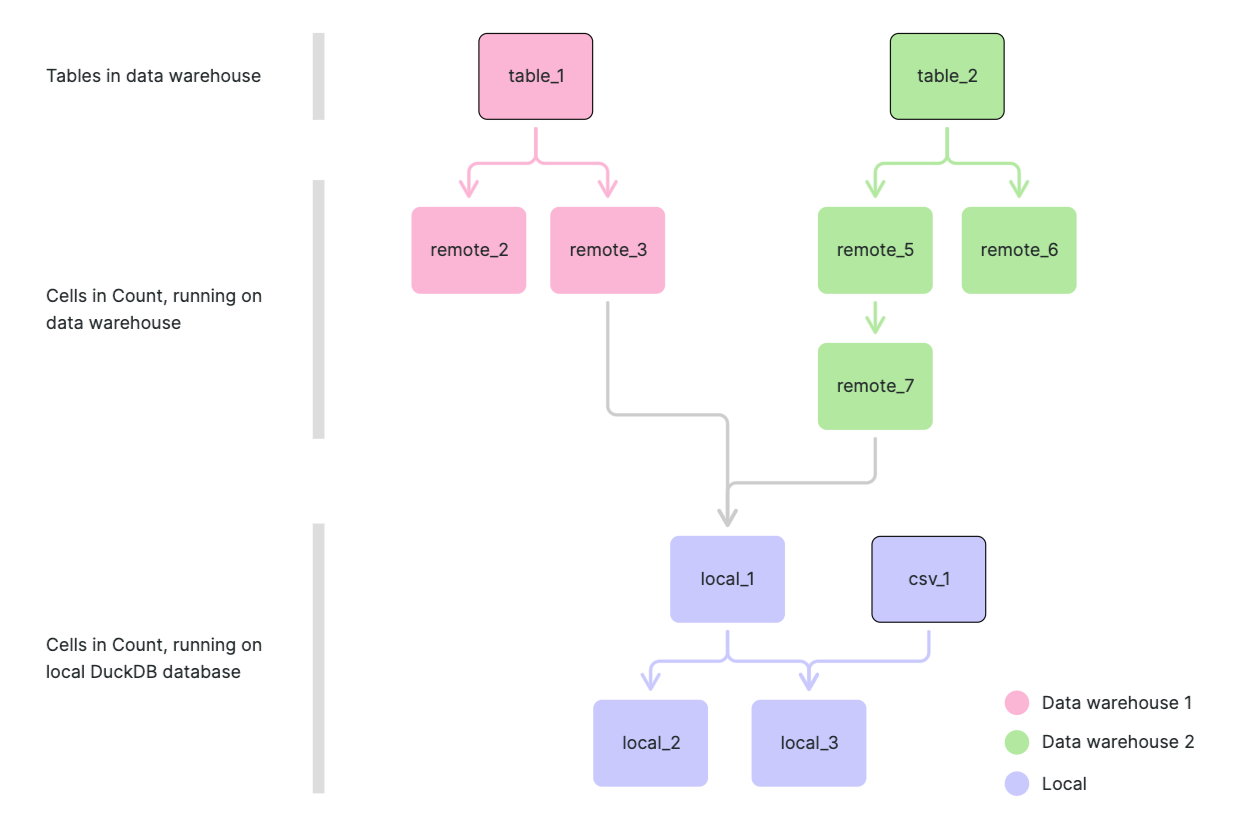 In addition to running queries on your data warehouse, Count also ships with a local database built on DuckDB. If you choose to set a cell's data source to Local, the queries for that cell will be run in your browser.