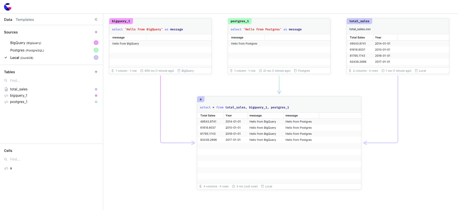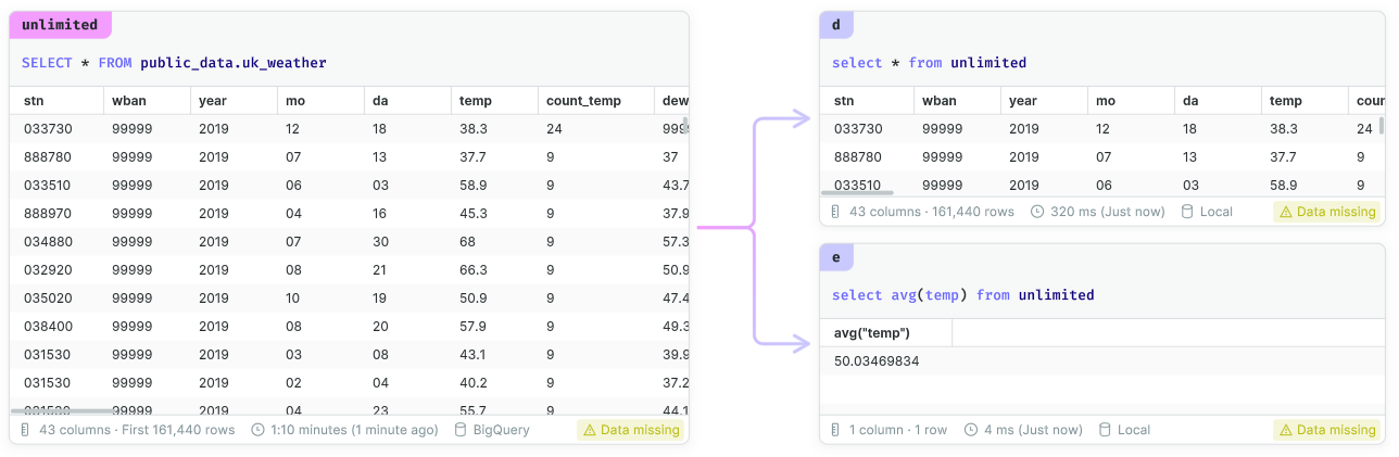 • Local cells can query the results of any other cell, as well as any CSV files that have been uploaded to the canvas.