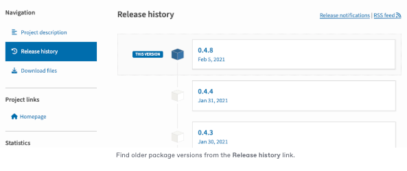 If the latest version of a package can't be installed, sometimes an earlier version can be. To find older package versions, click the Release history link and choose an older version. Then, follow steps 3 and 4 to try an older .whl file.