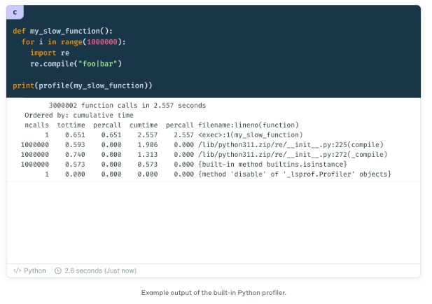 import cProfile, pstats, iofrom pstats import SortKeydef profile(func): pr = cProfile.Profile() pr.enable() func() pr.disable() s = io.StringIO() ps = pstats.Stats(pr, stream=s).sort_stats(SortKey.CUMULATIVE) ps.print_stats()return s.getvalue()