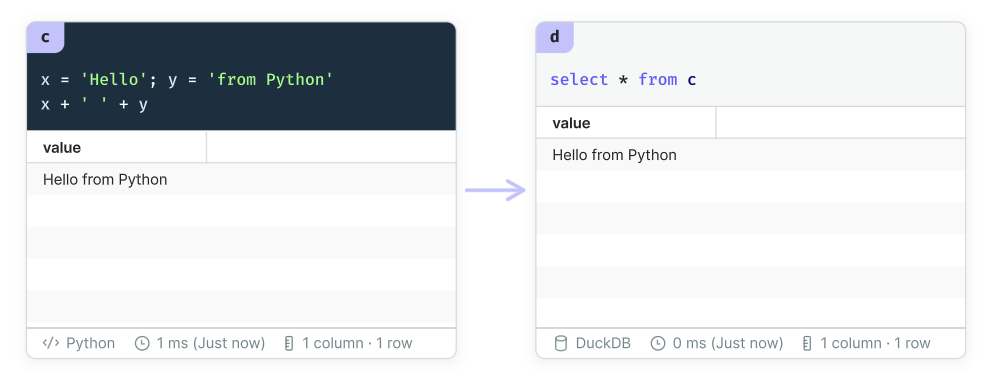 The last expression in a Python cell is special, and becomes the single output of that cell. If this output can be represented as a table, it can be queried by local DuckDB cells too: