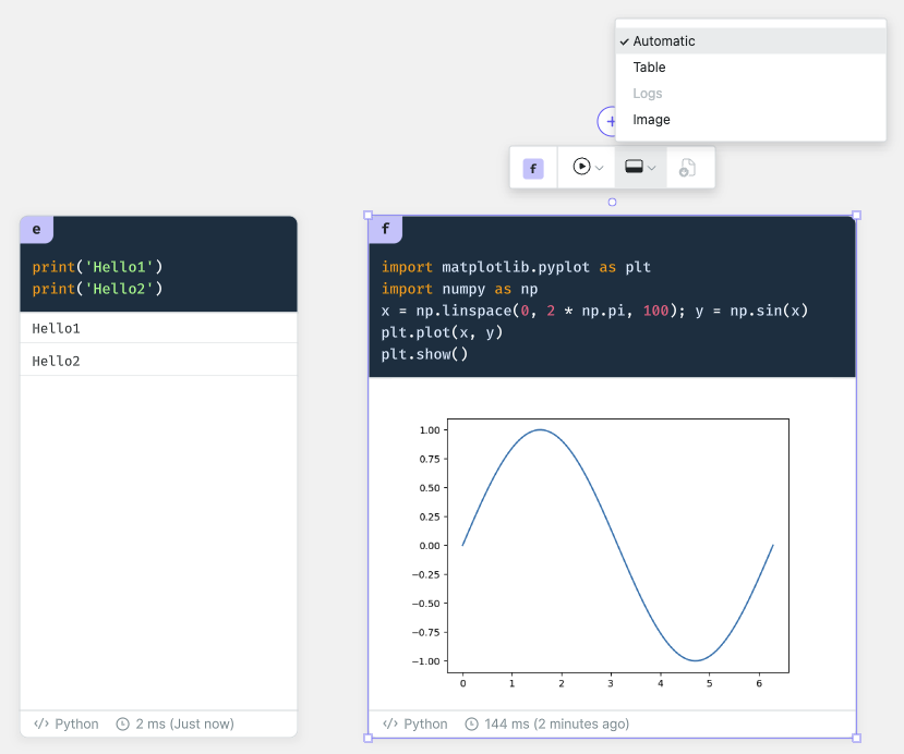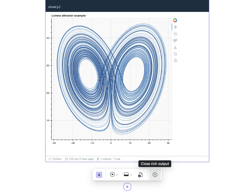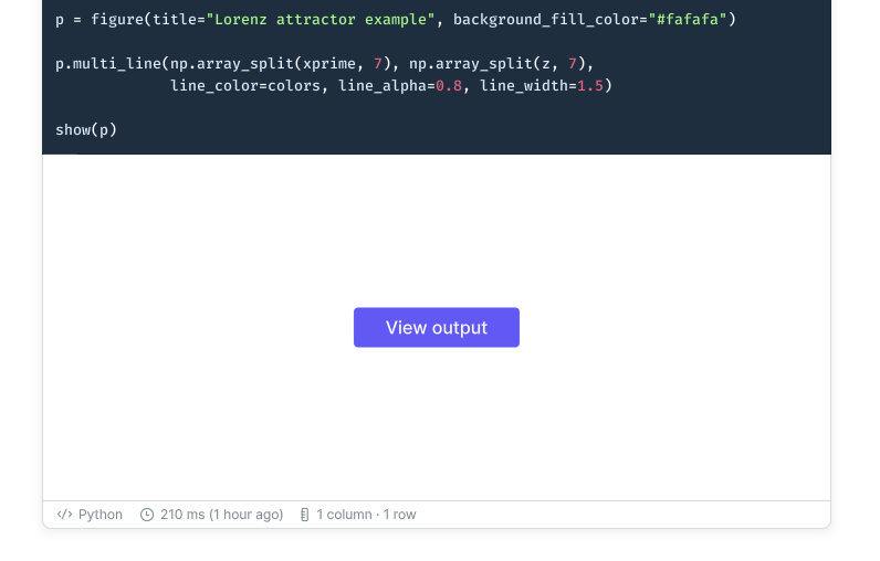 If a Python cell returns an object with an HTML representation, a View output button will appear. Clicking this button will cause the output to be displayed in the output section of the cell.