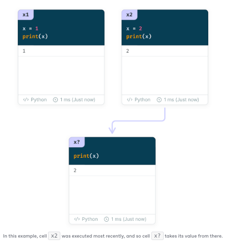 Unlike in a Jupyter notebook where cells execute top-to-bottom, in Count your Python cells execute in DAG order, just like SQL cells.