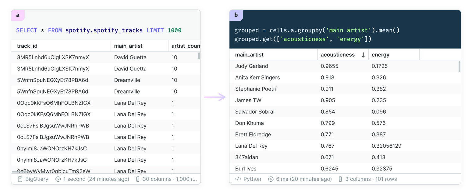 In Python cells, there is a special global cells variable that contains the results of other cells formatted as pandas DataFrames. Access cell results using keys or attributes on this object: