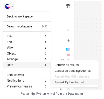 Python cells work very similarly to SQL cells, consisting of a text input area and an output area. Python cells are reactive just like all other cells, and their relationships are indicated by the same connector lines.