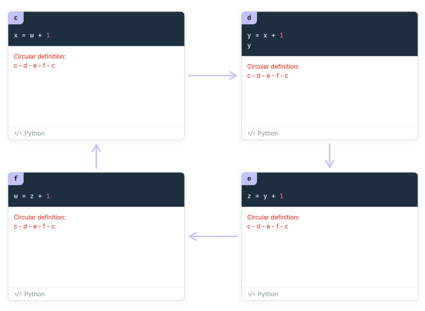Because Count executes cells reactively, it's possible to accidentally create circular dependencies. In this case, like other cells, Python cells will display an error and refuse to execute: