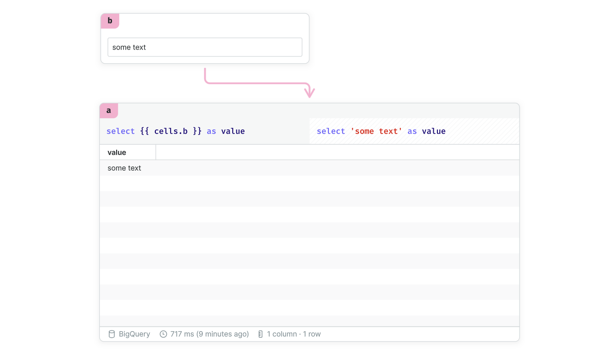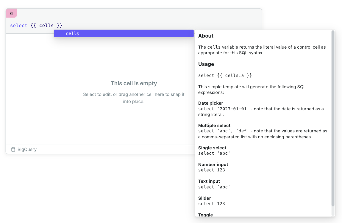 The cells variable can be used to access the value of control cells without the requirement to use subqueries or joins - the control cell value is compiled directly into the SQL query: