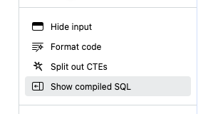 When you include Jinja delimiter tags in a SQL cell (i.e. any of {{, }}, {%, %}, {#, #}), Count will attempt to compile the cell text as a jinja template before executing the cell. To view the compiled SQL that is actually executed, click the Show compiled SQL button in the design bar: