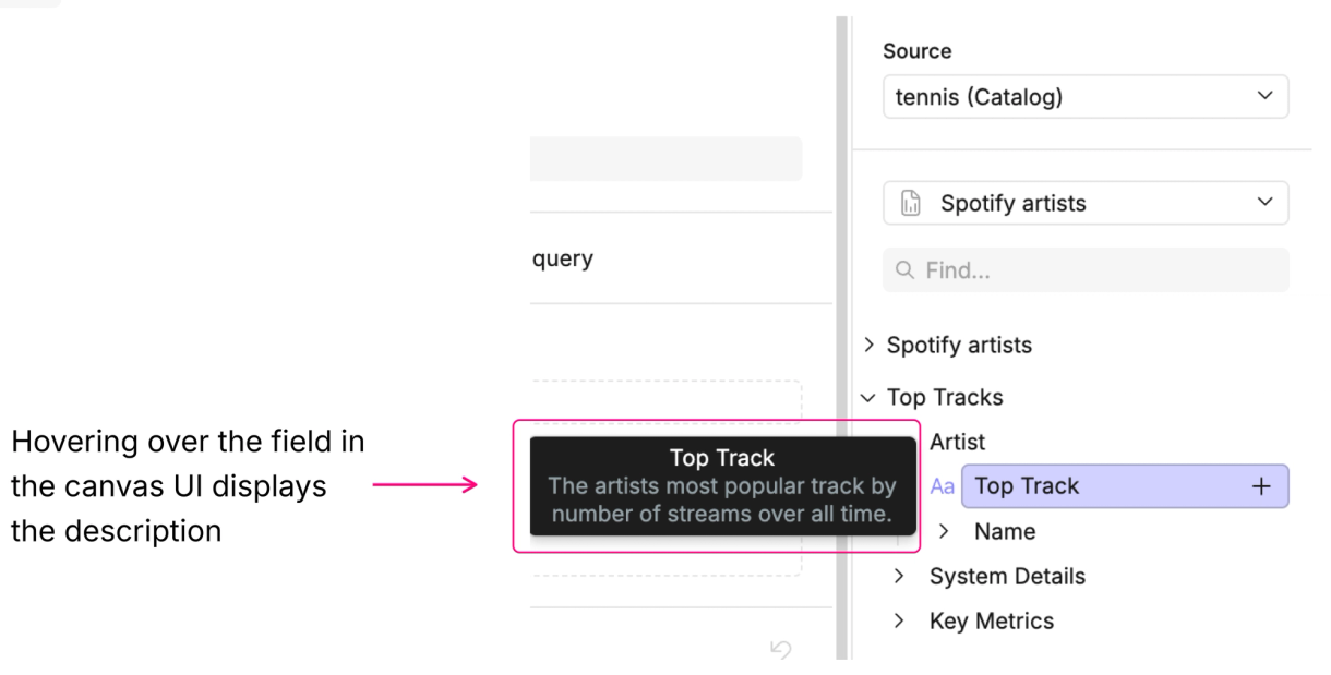 In the canvas UI, descriptions appear in tooltips when you hover over the field with your cursor.
