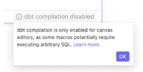 Because some dbt macros require executing arbitrary SQL, compilation involving complex dbt functionality is currently disabled for canvas viewers.