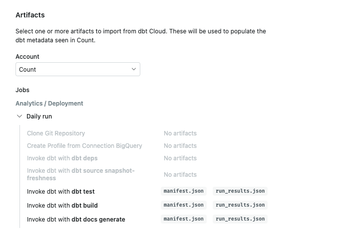 For each job, Count can extract dbt metadata by reading the manifest.json and/or run_results.json files for a particular step in that job. These files are referred to by dbt as Artifacts, and contain information about your models and tests.