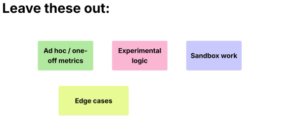 Skip ad hoc, experimental, or one-off metrics. Don’t include sandbox work or edge cases, as they clutter the catalog and undermine clarity. Keep the scope focused on what’s stable, valuable, and widely used. This ensures your catalog remains a reliable foundation for decision-making.