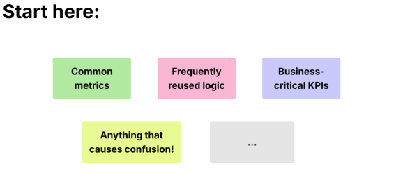 Focus on building your catalog around common metrics, frequently reused logic, and business-critical KPIs. Prioritize definitions that reduce confusion across teams. Start with what’s most impactful and broadly shared, so everyone benefits from consistent, trusted data.