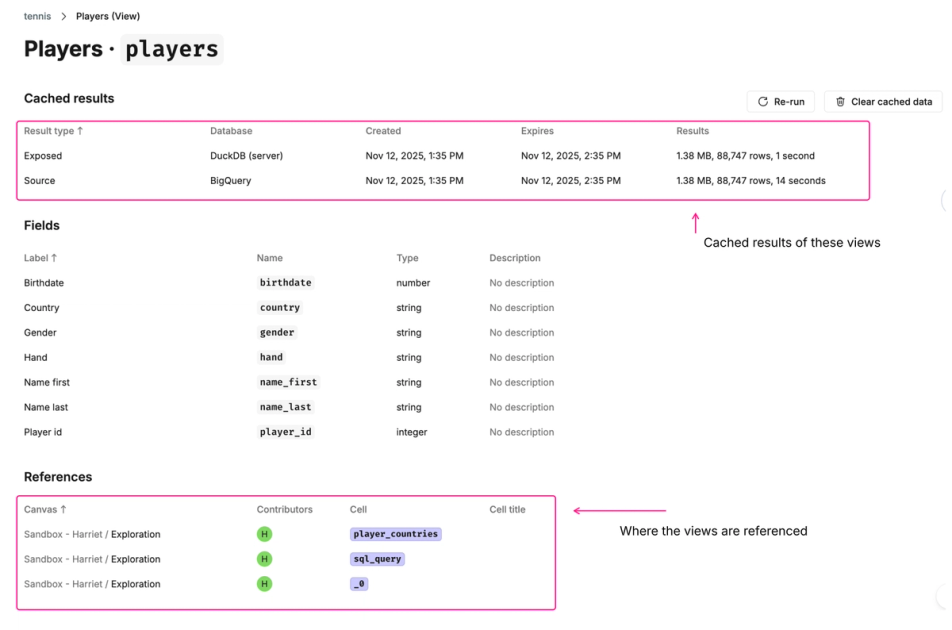 This will take you to the view information, which includes the fields, a list of the canvases where the view is referenced, and information about the cached results.