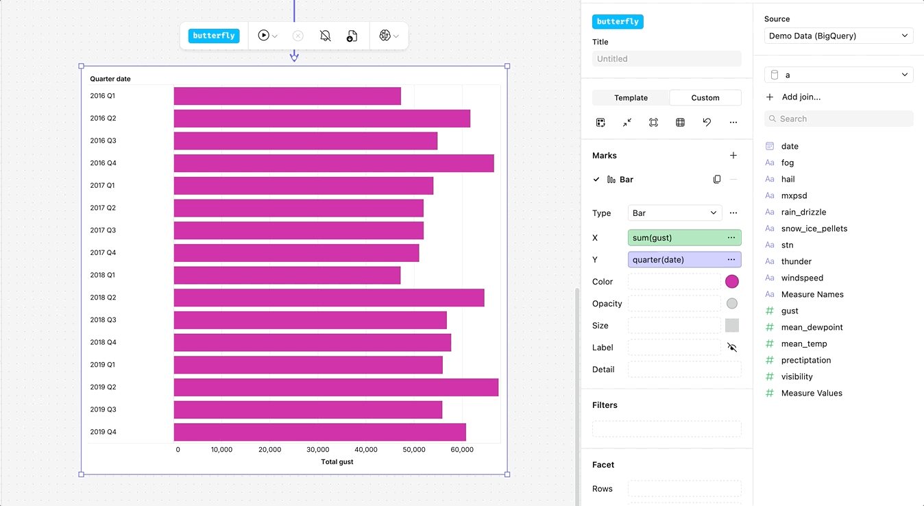 When comparing multiple measures it's sometimes helpful to make use of subplots. These create new axes onto which marks can be mapped.